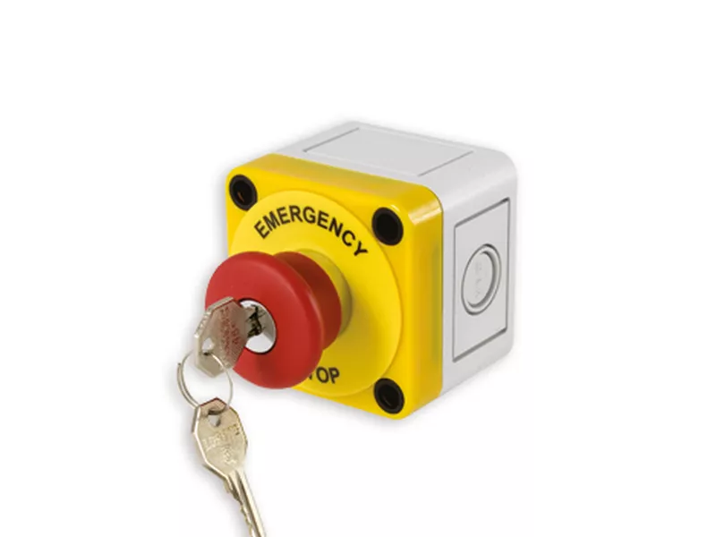 Przycisk awaryjnego zatrzymania, z blokadą resetowania i dwoma zestawami kluczy w komplecie.